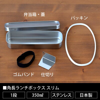 商品名 角長ランチボックス スリム 商品詳細 サイズ 本体サイズ:約 W200×D65×H45mm バンド含むサイズ:約 W200×D68×H48mm 容量 約350ml 素材 本体・仕切り:18-8ステンレス鋼(クロム18%・ニッケル8%) パッキン:シリコンゴム バンド:ゴム 原産国 日本 備考 ■食品が熱い時は冷ましてからフタをしてください。