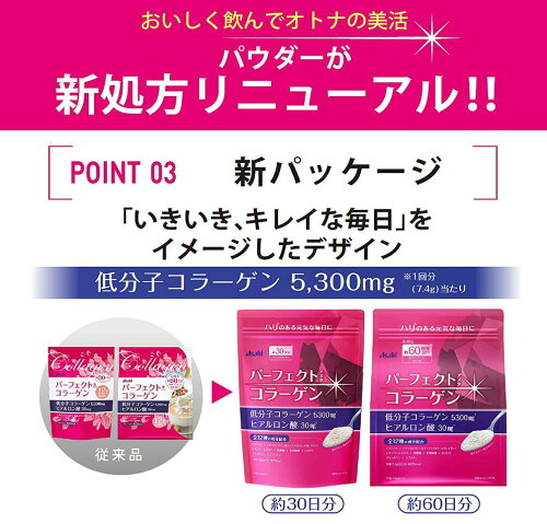 <パーフェクトアスタコラーゲンの特長> 1食分あたり低分子コラーゲン5300mg・ヒアルロン酸30mgに加え、グルコサミンをプラスしました。