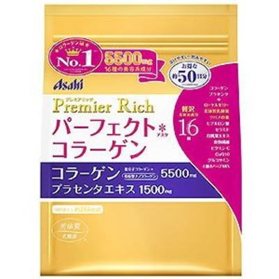 低分子コラーゲンに吸収型ナノコラーゲンをプラスし、コラーゲン量5500mgを配合! さらに、プラセンタ・セラミド・ローヤルゼリー・ツバメの巣・月桃葉エキスを新しく配合! 全16種の成分配合のプレミアム処方 <栄養成分表示 1回分(7.5g)当たり エネルギー:26kcal、たんぱく質:5.7g、脂 質:0g、炭水化物:1.1〜1.6g、糖 質:0.1〜0.6g 食物繊維:1.0g、食塩相当量:0.04〜0.12g、ビタミンC:100mg <製造時配合(1回分(7.5g)当たり)> コラーゲン:5500mg、ヒアルロン酸:30mg、殺菌乳酸菌粉末:30mg プラセンタエキス末:54.5mg(エキス換算:1500mg)、月桃葉エキス:3mg セラミド:600μg、ローヤルゼリーエキス:1mg、グルコサミン:10mg CoQ10:2mg <パーフェクトアスタコラーゲンプレミアムリッチの原材料> 豚コラーゲンペプチド、難消化性デキストリン、月桃葉エキス末、デキストリン、豚プラセンタエキス末、 殺菌乳酸菌粉末、セラミド含有パイナップル抽出物末、食用油脂、ローヤルゼリーエキス末、 コエンザイムQ10、混合ハーブ抽出物末(デキストリン、ドクダミ、セイヨウサンザシ、ローマカミツレ、 ブドウ葉)、酵素処理燕窩末/V.C、ヒアルロン酸、グルコサミン(えび・かに由来)、糊料(プルラン)、 香料、甘味料(アセスルファムK、スクラロース) <パーフェクトアスタコラーゲンプレミアムリッチのお召し上がり方> 1日1〜2回(1回7.4g)を目安に飲み物や食べ物に溶かしてお召し上がりください。