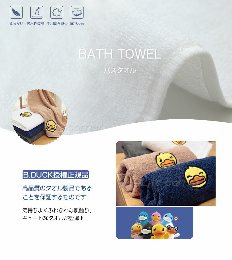 アイテム情報 商品仕様 商品名:B.DUCK バスタオル 入 数: 2枚 サイズ: 約140*70cm /枚 色 : ホワイト、ベージュ、カーキ、ネイビー 用 途: 家庭用タオル 業務用タオル 子供用タオル 商品ポイント 1.細い糸で織られたこのタオルは、吸水性が抜群です。