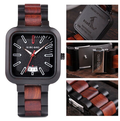 商品名: 木製 腕時計 商品説明: ムーブメント:クォーツ ケースの形:正方形 ケース 材質:木製 ダイヤル直径:40cm 厚さ:11.2mm ダイヤル窓材質:ハードレックス バンド 材質:木製 長さ:220mm 幅:22mm 留め金タイプ:折りたたみ式安全留め金 重量: 58g 防水機能:なし 特徴:夜光針 日付表示 付属品:ベルト調節器具 * 写真と実物の木目は自然素材のため1点ごとに異なります。