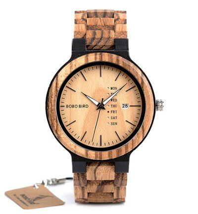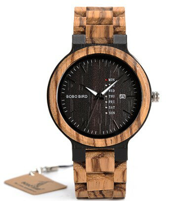 商品名: 木製 腕時計 商品説明: メーカー:BOBO BIRD ボボバード ムーブメント:クォーツ 直径:45.6cm 厚さ:12mm 形:円形 ダイヤル窓材質:ハードレックス バンド 材質:木製 長さ:210mm 幅:230mm 留め金タイプ:折りたたみ式安全留め金 重量: 51g 防水機能:なし 特徴:週・日付表示 夜光針 ※写真と実物の木目は自然素材のため1点ごとに異なります。