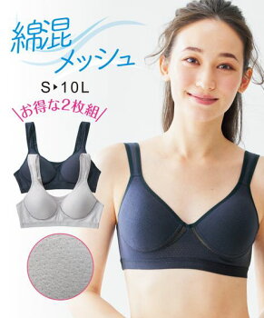 ブラジャー ノンワイヤー 大きいサイズ レディース 綿混 メッシュ アンダーメッシュテープ付 穴あき モールド ハーフトップ 2枚組 ネイビー+グレー 4L/5L/6L ニッセン nissen
