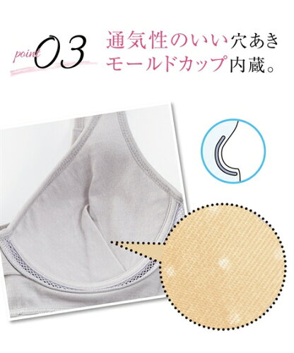 取り外し可能な穴あきモールドカップ内蔵で、太め肩ひもでくいこみにくく着け心地もラクちんです。