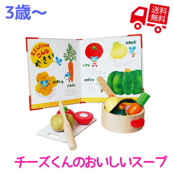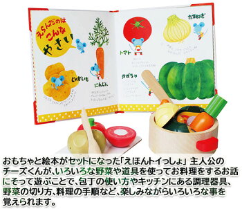 〜絵本と木のおもちゃがいっしょになった 『えほんトイっしょ』シリーズ!主人公のチーズくんが、いろいろな野菜や道具を使ってお料理をするお話にそって遊ぶことで、包丁の使い方やキッチンにある調理器具、野菜の切り方、料理の手順など、楽しみながらいろいろな事を覚えられます。