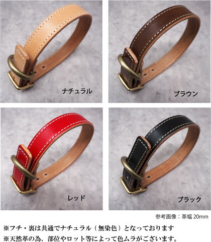 商品説明 ■推奨体重 体重5〜12キロまでのワンちゃん ■素材 本ヌメ革(タンニンなめし革) / 金具:真鍮製 ■仕様 革幅:2.0cm 穴の数:5個(1.5cm間隔) ■サイズ 28cm〜38cmからオーダー ※バックル先端から中央の穴までの 製作サイズをご指定下さい ■生産国 日本(オーダーメイド) ■素材について 当店の商品はすべて天然の本革(ヌメ革)を使用して製作しております。